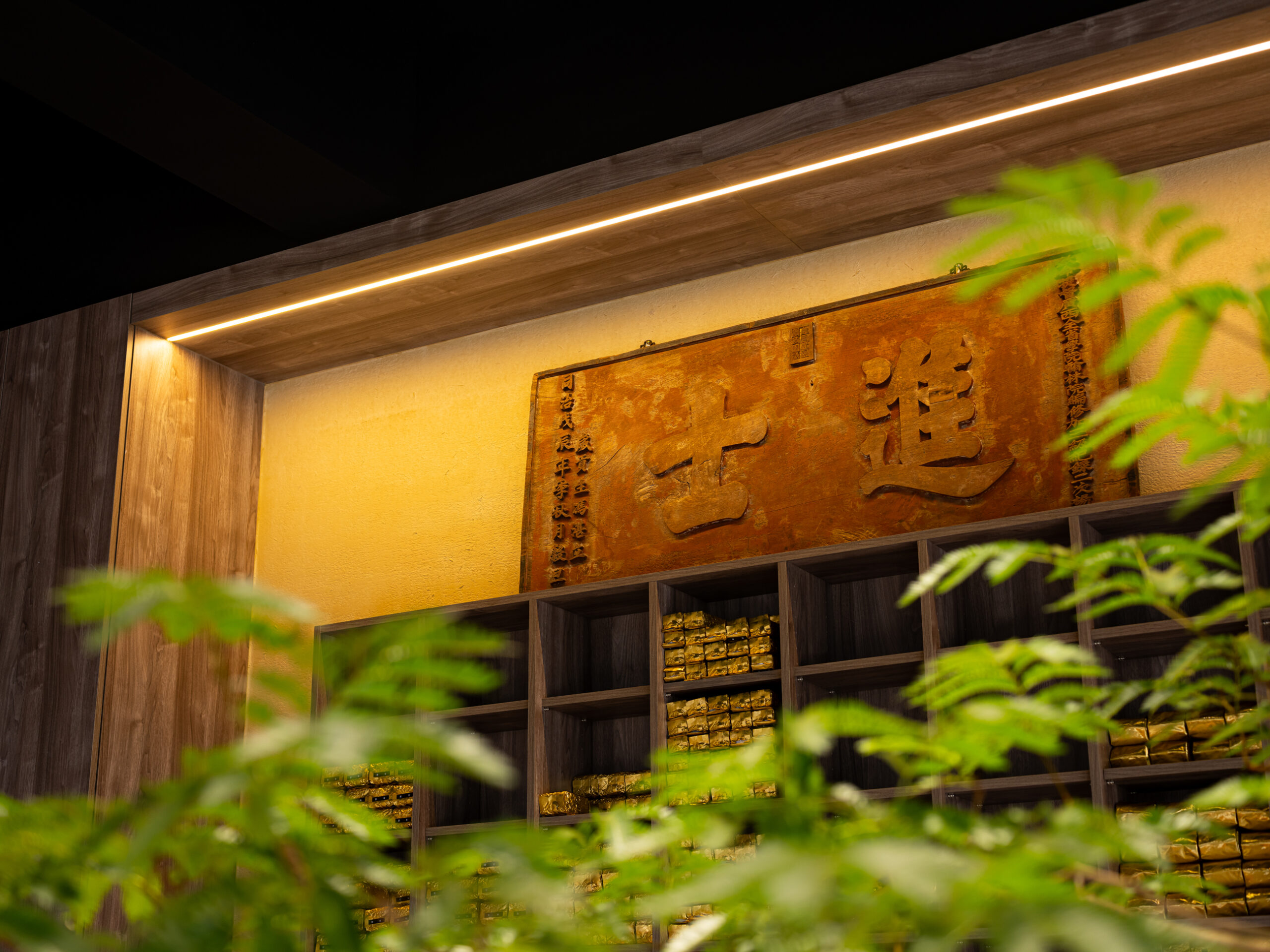 柔和的崁燈光輕輕灑落在深色的舊木上,夜晚依舊能照亮每一個角落的細節。老陳的腐舊感,為空間帶來一絲溫暖與獨特美感,使每一次停留都像翻閱一段時光的記憶。